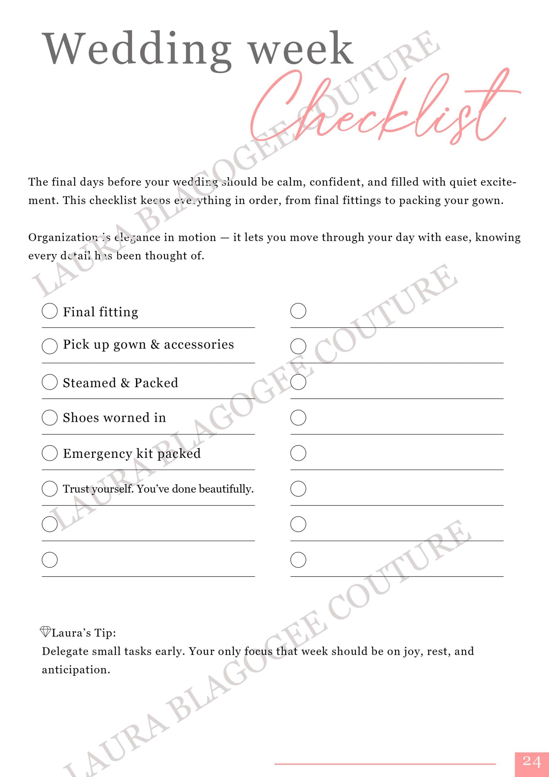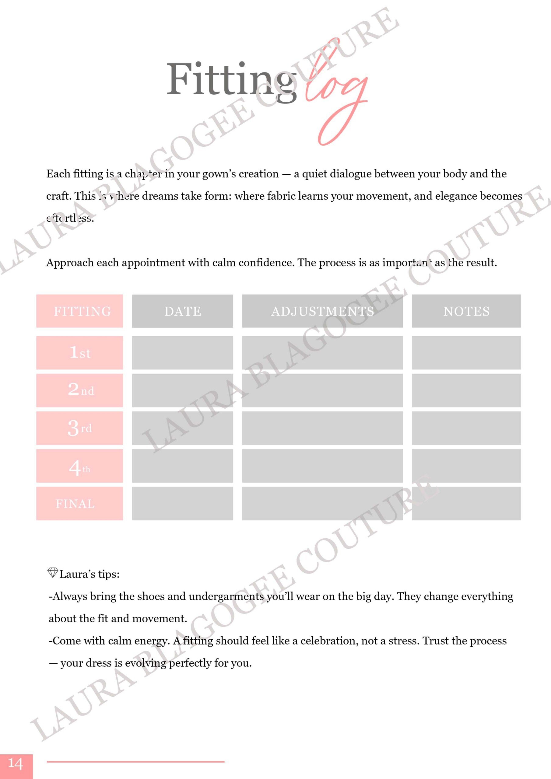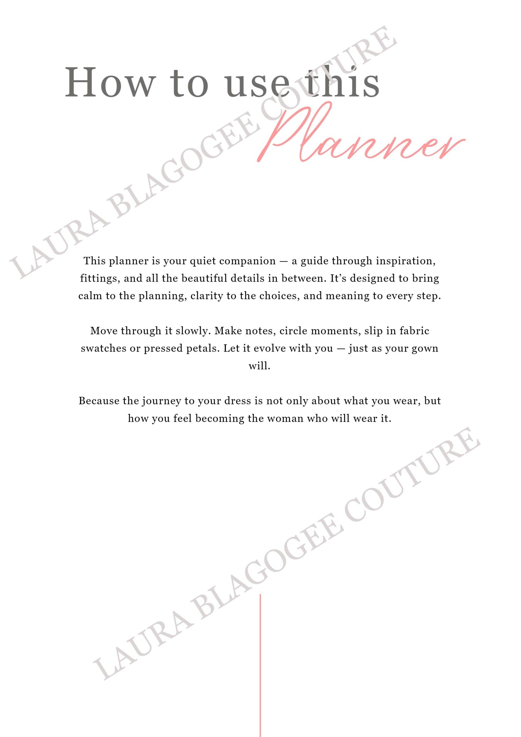 Designed by Laura Blagogee, French-born designer and founder of Laura Blagogee Couture, this planner blends couture expertise with emotional insight — turning the dress-selection process into a beautiful, meaningful ritual.