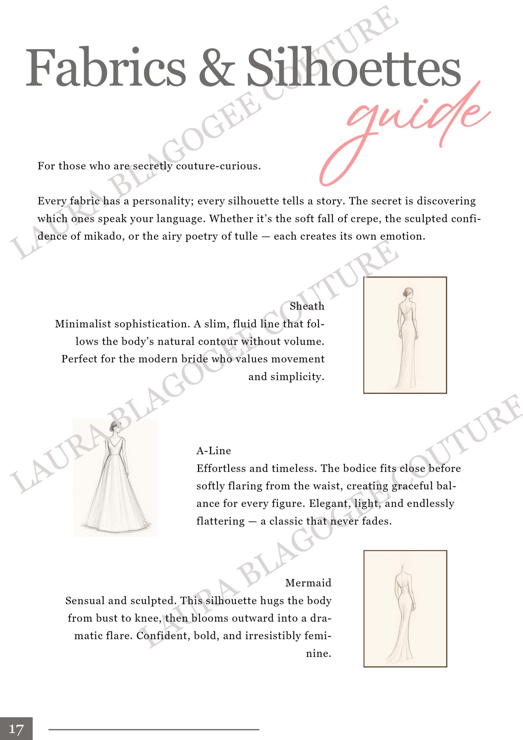 Silhouettes & fabric guide with couture-style pencil illustrations